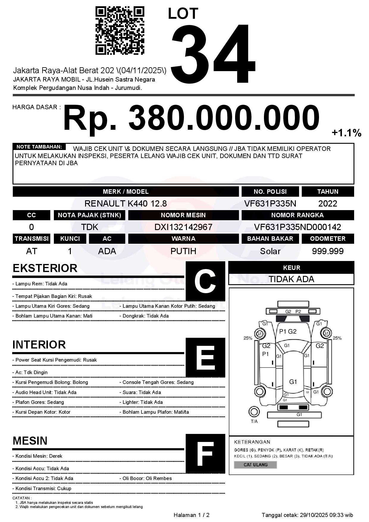 - CatatanWAJIB CEK UNIT & DOKUMEN SECARA LANGSUNG // JBA TIDAK MEMILIKI OPERATOR UNTUK MELAKUKAN INSPEKSI, PESERTA LELANG WAJIB CEK UNIT, DOKUMEN DAN TTD SURAT PERNYATAAN DI JBA