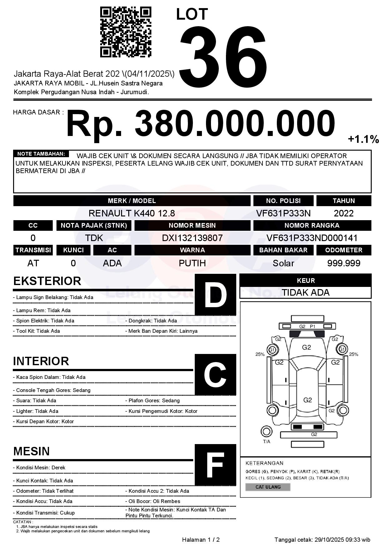 - CatatanWAJIB CEK UNIT & DOKUMEN SECARA LANGSUNG // JBA TIDAK MEMILIKI OPERATOR UNTUK MELAKUKAN INSPEKSI, PESERTA LELANG WAJIB CEK UNIT, DOKUMEN DAN TTD SURAT PERNYATAAN BERMATERAI DI JBA //