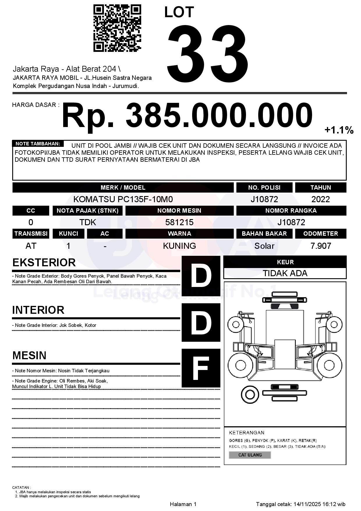 - CatatanUNIT DI POOL JAMBI // WAJIB CEK UNIT DAN DOKUMEN SECARA LANGSUNG // INVOICE ADA FOTOKOPI//JBA TIDAK MEMILIKI OPERATOR UNTUK MELAKUKAN INSPEKSI, PESERTA LELANG WAJIB CEK UNIT, DOKUMEN DAN TTD SURAT PERNYATAAN BERMATERAI DI JBA