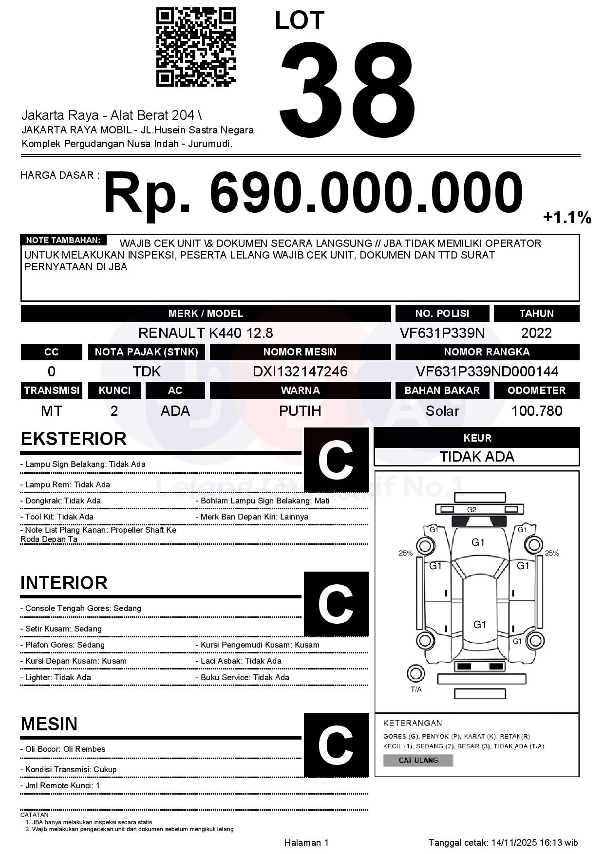 - CatatanWAJIB CEK UNIT & DOKUMEN SECARA LANGSUNG // JBA TIDAK MEMILIKI OPERATOR UNTUK MELAKUKAN INSPEKSI, PESERTA LELANG WAJIB CEK UNIT, DOKUMEN DAN TTD SURAT PERNYATAAN DI JBA