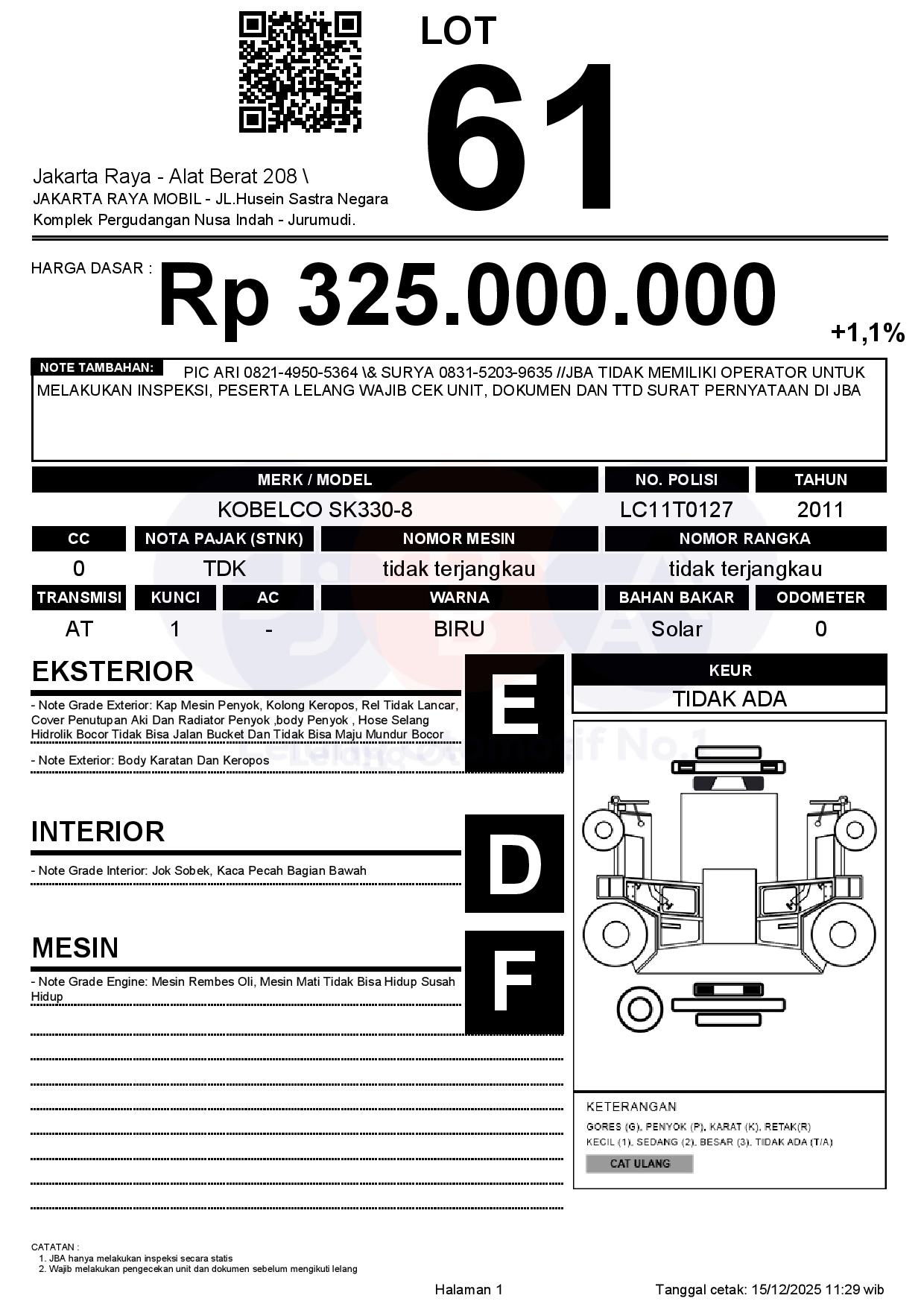 - CatatanPIC ARI 0821-4950-5364 & SURYA 0831-5203-9635 //JBA TIDAK MEMILIKI OPERATOR UNTUK MELAKUKAN INSPEKSI, PESERTA LELANG WAJIB CEK UNIT, DOKUMEN DAN TTD SURAT PERNYATAAN DI JBA