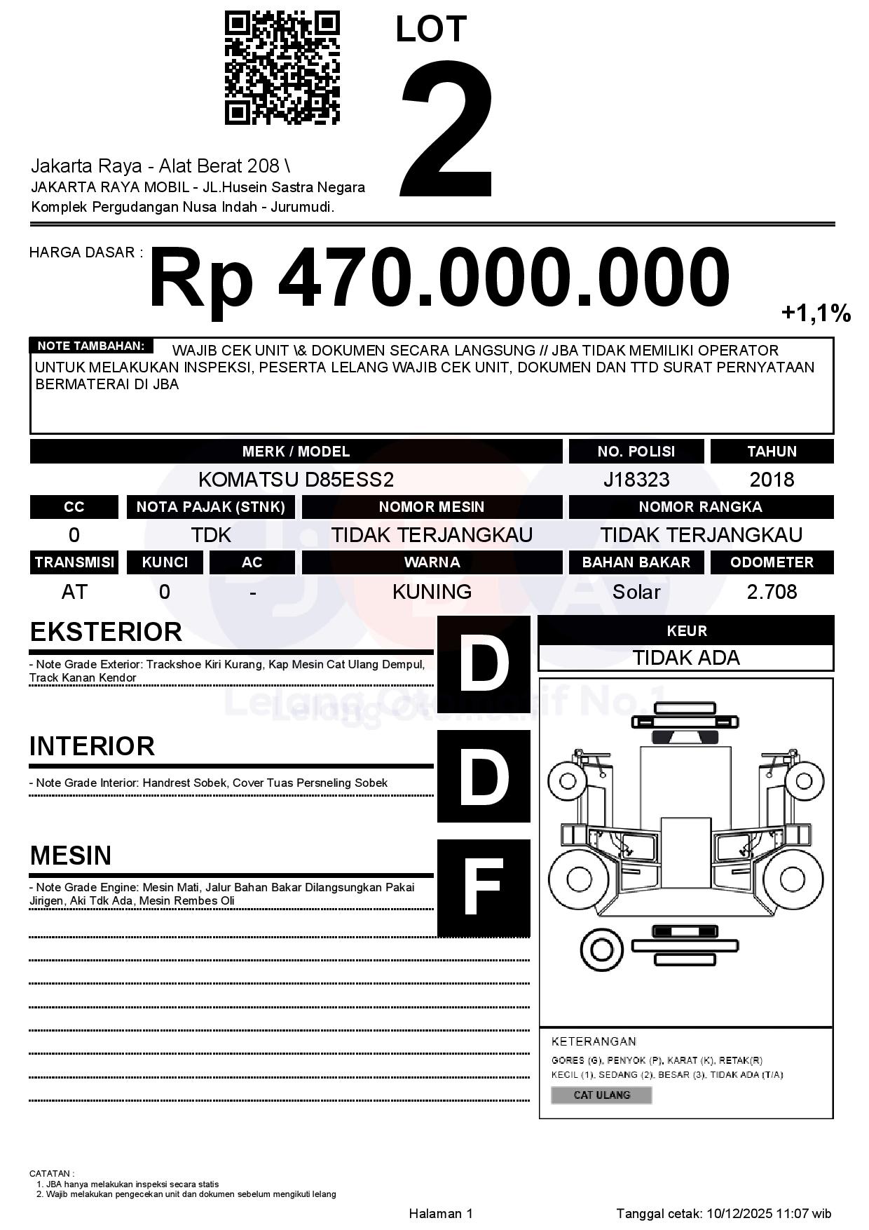 - CatatanWAJIB CEK UNIT & DOKUMEN SECARA LANGSUNG // JBA TIDAK MEMILIKI OPERATOR UNTUK MELAKUKAN INSPEKSI, PESERTA LELANG WAJIB CEK UNIT, DOKUMEN DAN TTD SURAT PERNYATAAN BERMATERAI DI JBA