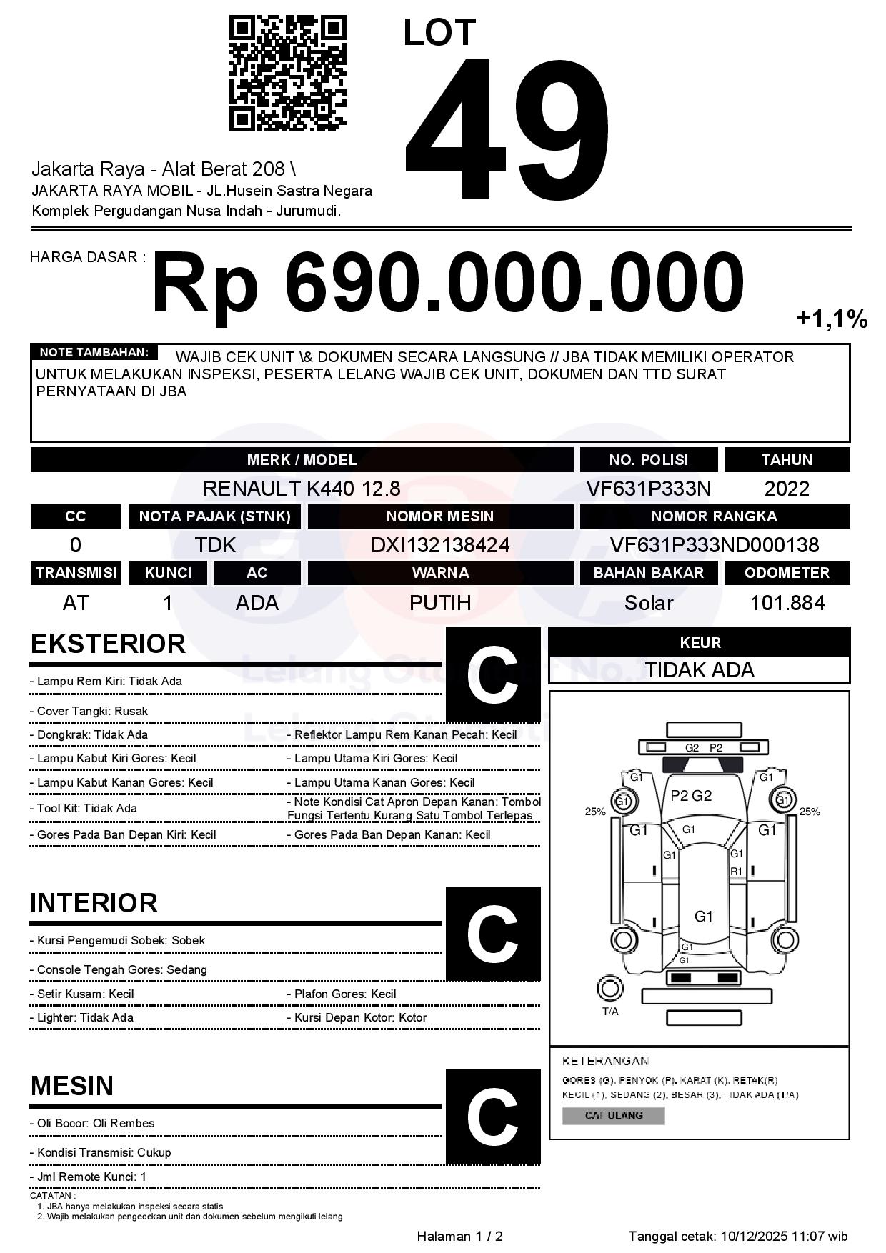 - CatatanWAJIB CEK UNIT & DOKUMEN SECARA LANGSUNG // JBA TIDAK MEMILIKI OPERATOR UNTUK MELAKUKAN INSPEKSI, PESERTA LELANG WAJIB CEK UNIT, DOKUMEN DAN TTD SURAT PERNYATAAN DI JBA
