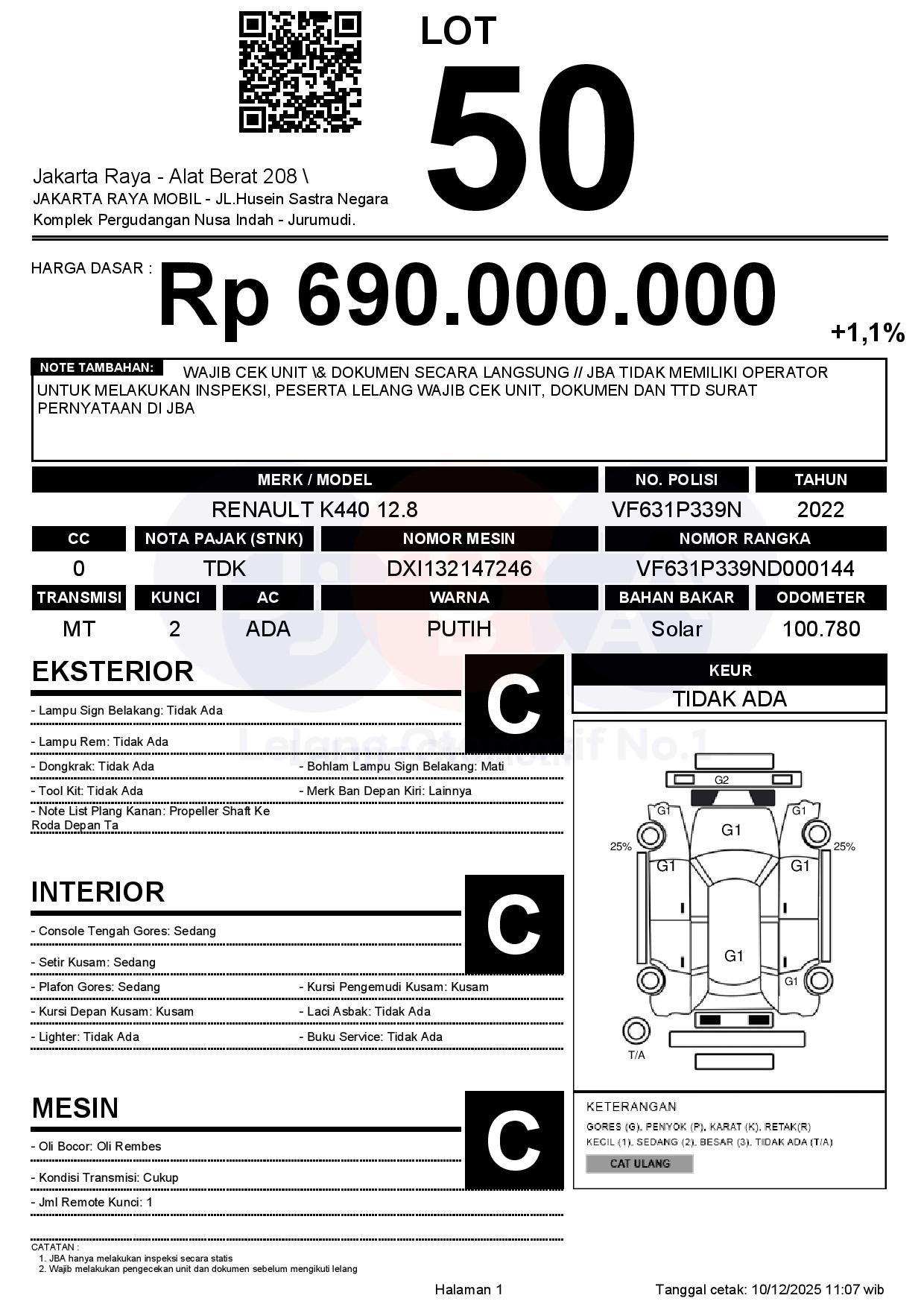 - CatatanWAJIB CEK UNIT & DOKUMEN SECARA LANGSUNG // JBA TIDAK MEMILIKI OPERATOR UNTUK MELAKUKAN INSPEKSI, PESERTA LELANG WAJIB CEK UNIT, DOKUMEN DAN TTD SURAT PERNYATAAN DI JBA