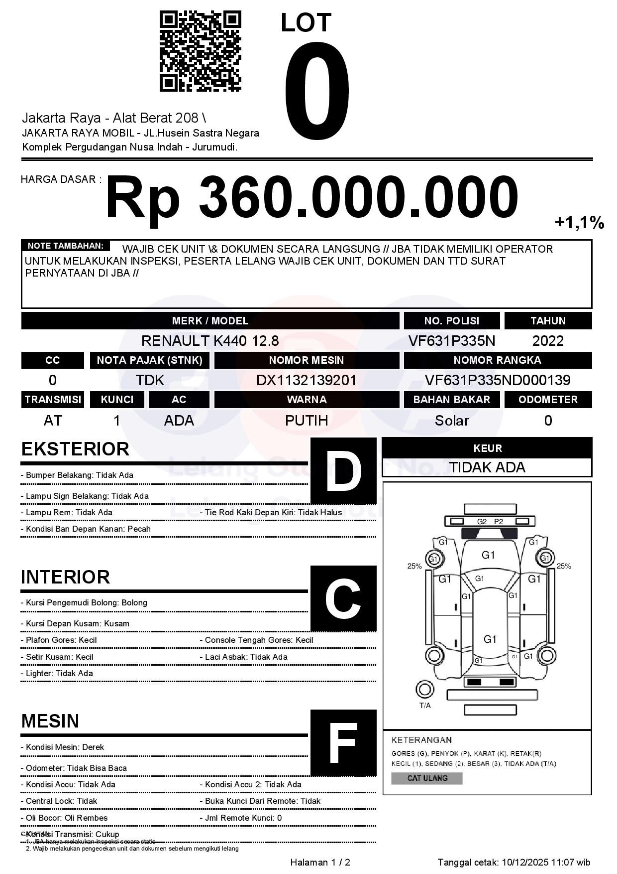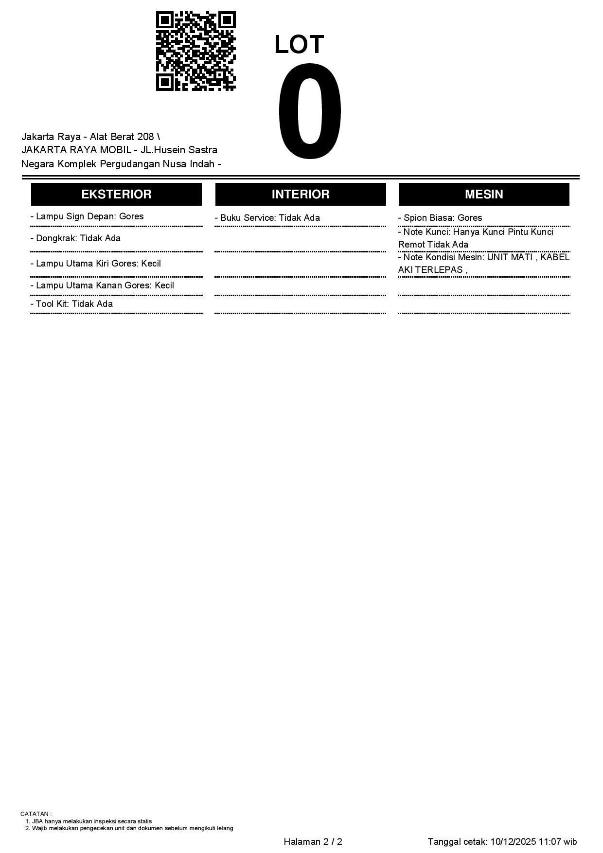 - CatatanWAJIB CEK UNIT & DOKUMEN SECARA LANGSUNG // JBA TIDAK MEMILIKI OPERATOR UNTUK MELAKUKAN INSPEKSI, PESERTA LELANG WAJIB CEK UNIT, DOKUMEN DAN TTD SURAT PERNYATAAN DI JBA //