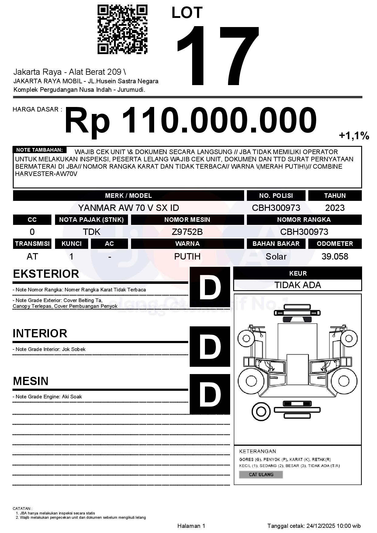 - CatatanWAJIB CEK UNIT & DOKUMEN SECARA LANGSUNG // JBA TIDAK MEMILIKI OPERATOR UNTUK MELAKUKAN INSPEKSI, PESERTA LELANG WAJIB CEK UNIT, DOKUMEN DAN TTD SURAT PERNYATAAN BERMATERAI DI JBA// NOMOR RANGKA KARAT DAN TIDAK TERBACA// WARNA (MERAH PUTIH)// COMBINE HARVESTER-AW70V