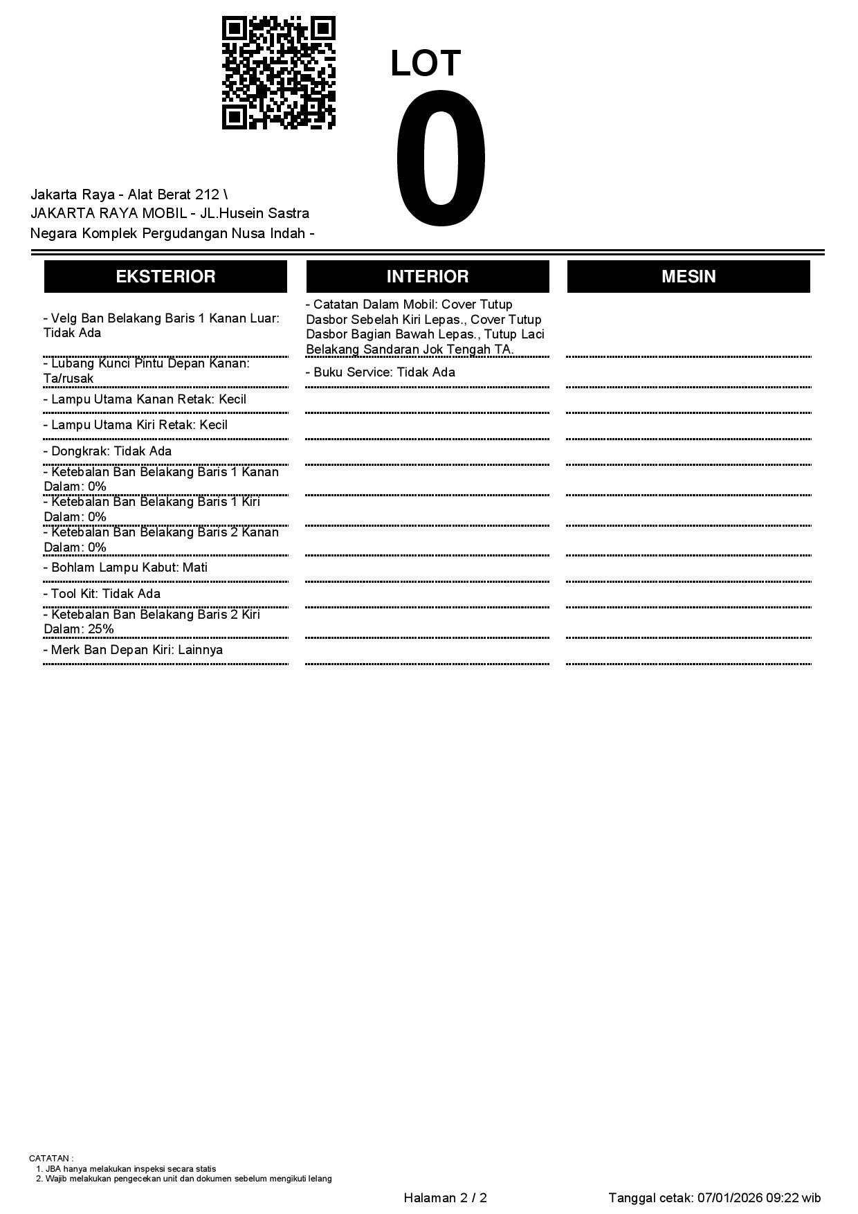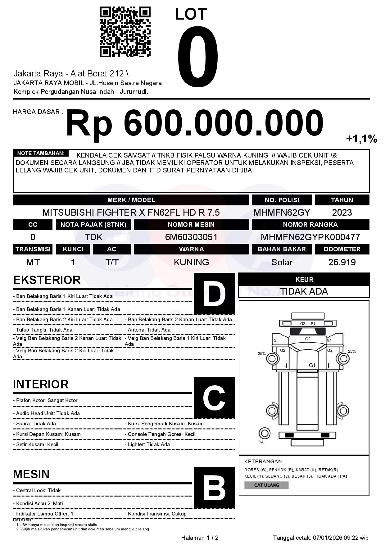 - CatatanKENDALA CEK SAMSAT // TNKB FISIK PALSU WARNA KUNING // WAJIB CEK UNIT & DOKUMEN SECARA LANGSUNG // JBA TIDAK MEMILIKI OPERATOR UNTUK MELAKUKAN INSPEKSI, PESERTA LELANG WAJIB CEK UNIT, DOKUMEN DAN TTD SURAT PERNYATAAN DI JBA