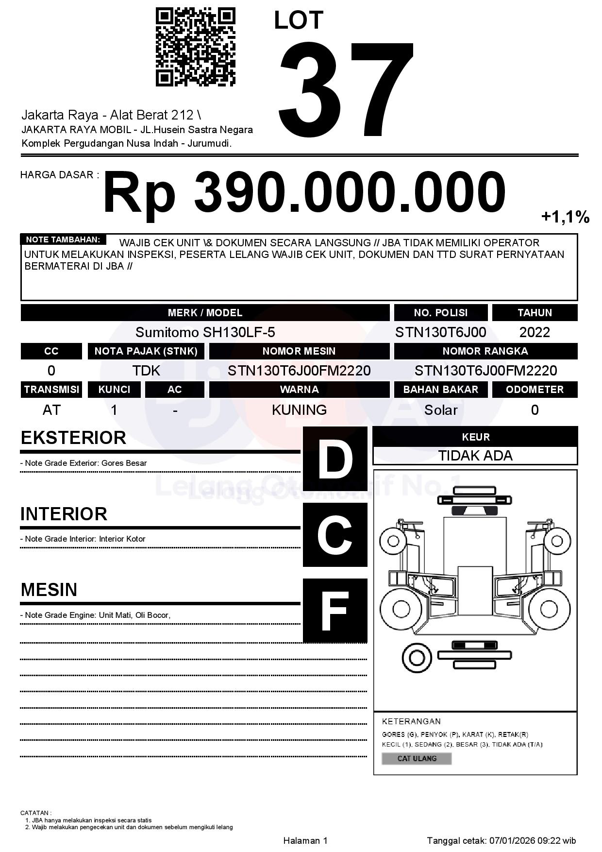 - CatatanWAJIB CEK UNIT & DOKUMEN SECARA LANGSUNG // JBA TIDAK MEMILIKI OPERATOR UNTUK MELAKUKAN INSPEKSI, PESERTA LELANG WAJIB CEK UNIT, DOKUMEN DAN TTD SURAT PERNYATAAN BERMATERAI DI JBA //