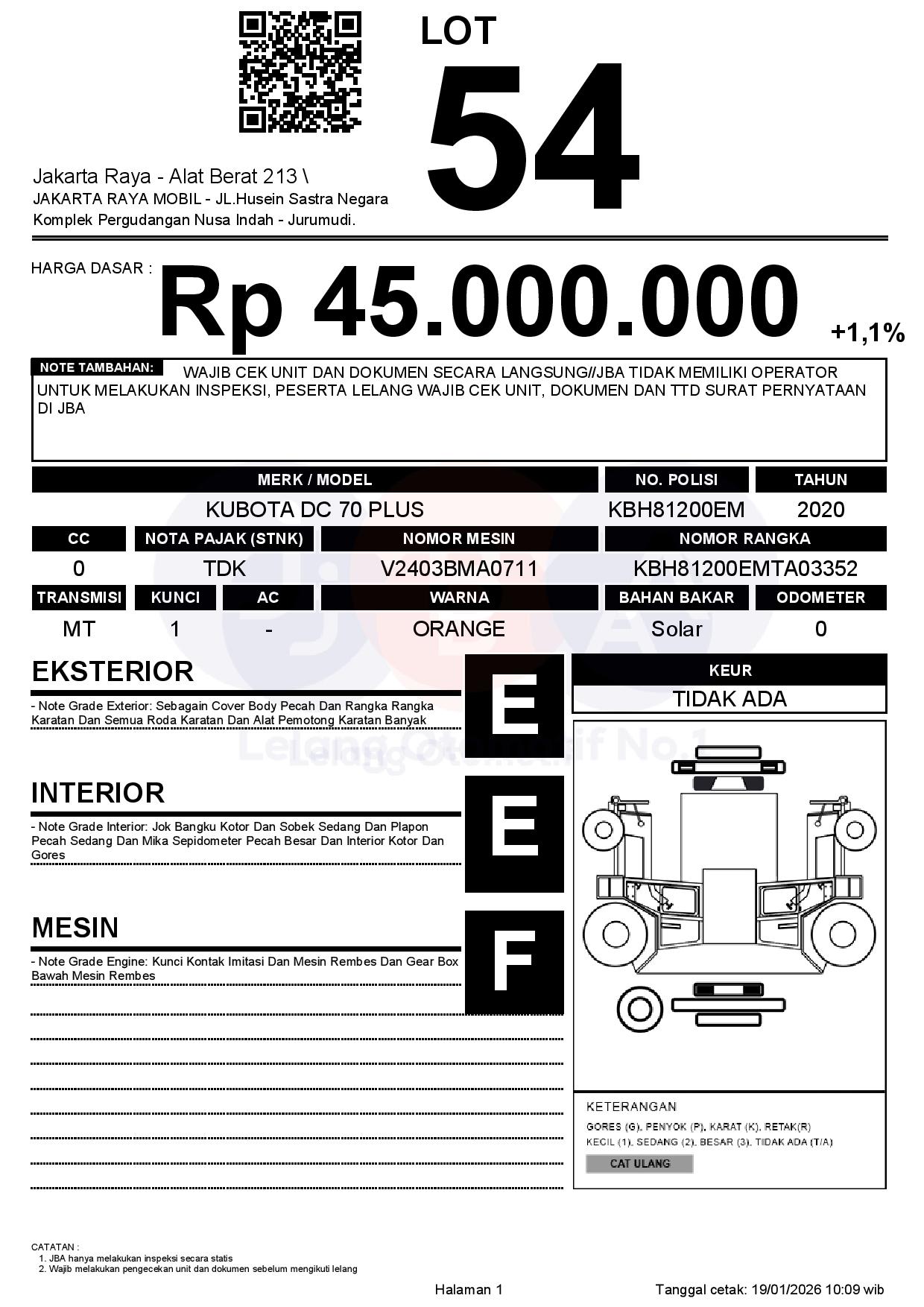 - CatatanWAJIB CEK UNIT DAN DOKUMEN SECARA LANGSUNG//JBA TIDAK MEMILIKI OPERATOR UNTUK MELAKUKAN INSPEKSI, PESERTA LELANG WAJIB CEK UNIT, DOKUMEN DAN TTD SURAT PERNYATAAN DI JBA