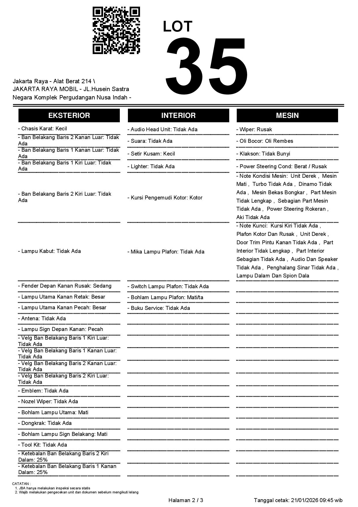 - CatatanWAJIB CEK UNIT & DOKUMEN SECARA LANGSUNG // JBA TIDAK MEMILIKI OPERATOR UNTUK MELAKUKAN INSPEKSI, PESERTA LELANG WAJIB CEK UNIT, DOKUMEN DAN TTD SURAT PERNYATAAN DI JBA