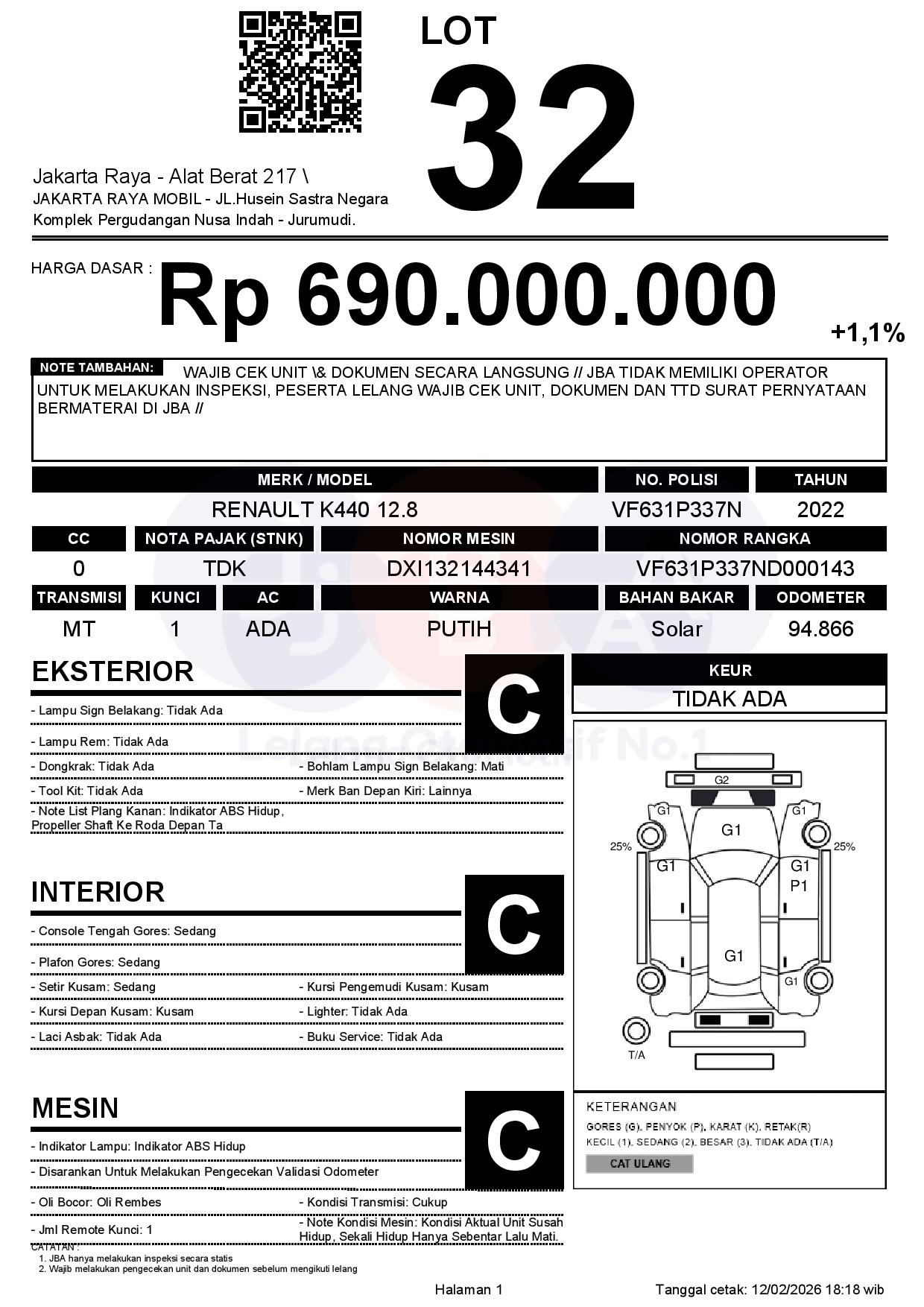 - CatatanWAJIB CEK UNIT & DOKUMEN SECARA LANGSUNG // JBA TIDAK MEMILIKI OPERATOR UNTUK MELAKUKAN INSPEKSI, PESERTA LELANG WAJIB CEK UNIT, DOKUMEN DAN TTD SURAT PERNYATAAN BERMATERAI DI JBA //