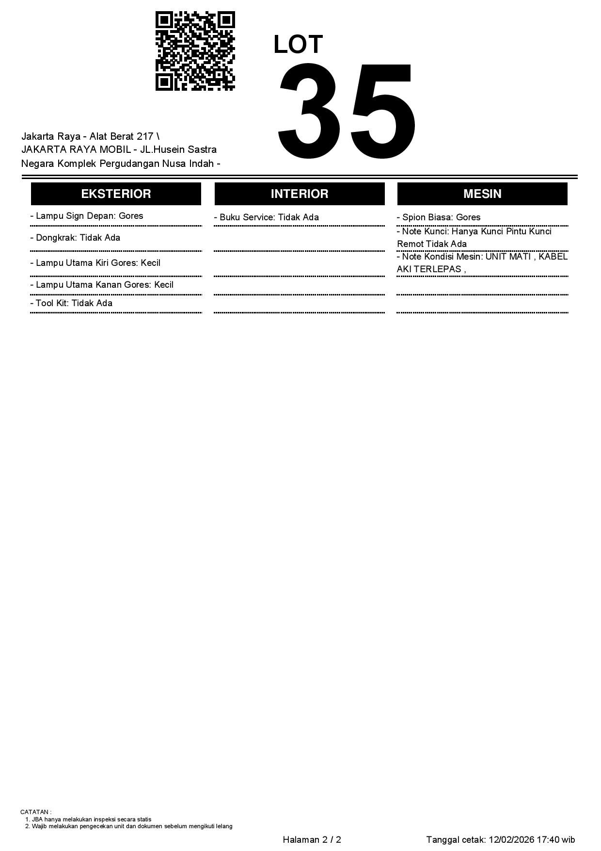 - CatatanWAJIB CEK UNIT & DOKUMEN SECARA LANGSUNG // JBA TIDAK MEMILIKI OPERATOR UNTUK MELAKUKAN INSPEKSI, PESERTA LELANG WAJIB CEK UNIT, DOKUMEN DAN TTD SURAT PERNYATAAN DI JBA //