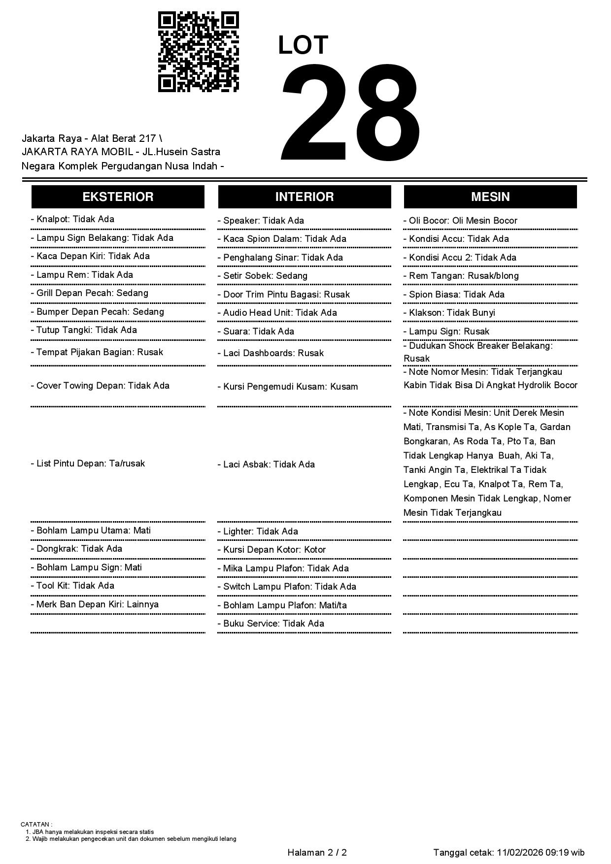- CatatanWAJIB CEK UNIT & DOKUMEN SECARA LANGSUNG // JBA TIDAK MEMILIKI OPERATOR UNTUK MELAKUKAN INSPEKSI, PESERTA LELANG WAJIB CEK UNIT, DOKUMEN DAN TTD SURAT PERNYATAAN BERMATERAI DI JBA // FOTO NOSIN TDK TERJANGKAU //