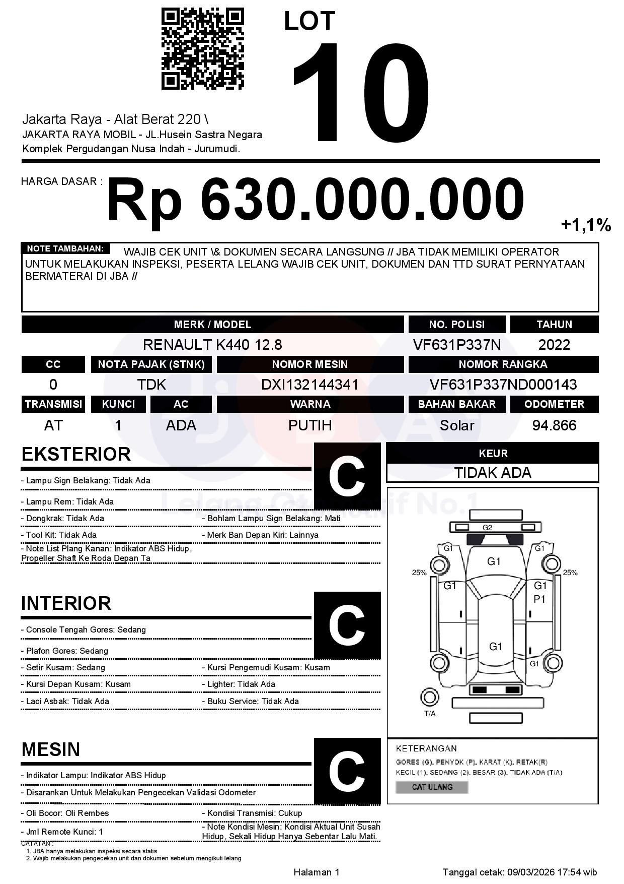 - CatatanWAJIB CEK UNIT & DOKUMEN SECARA LANGSUNG // JBA TIDAK MEMILIKI OPERATOR UNTUK MELAKUKAN INSPEKSI, PESERTA LELANG WAJIB CEK UNIT, DOKUMEN DAN TTD SURAT PERNYATAAN BERMATERAI DI JBA //