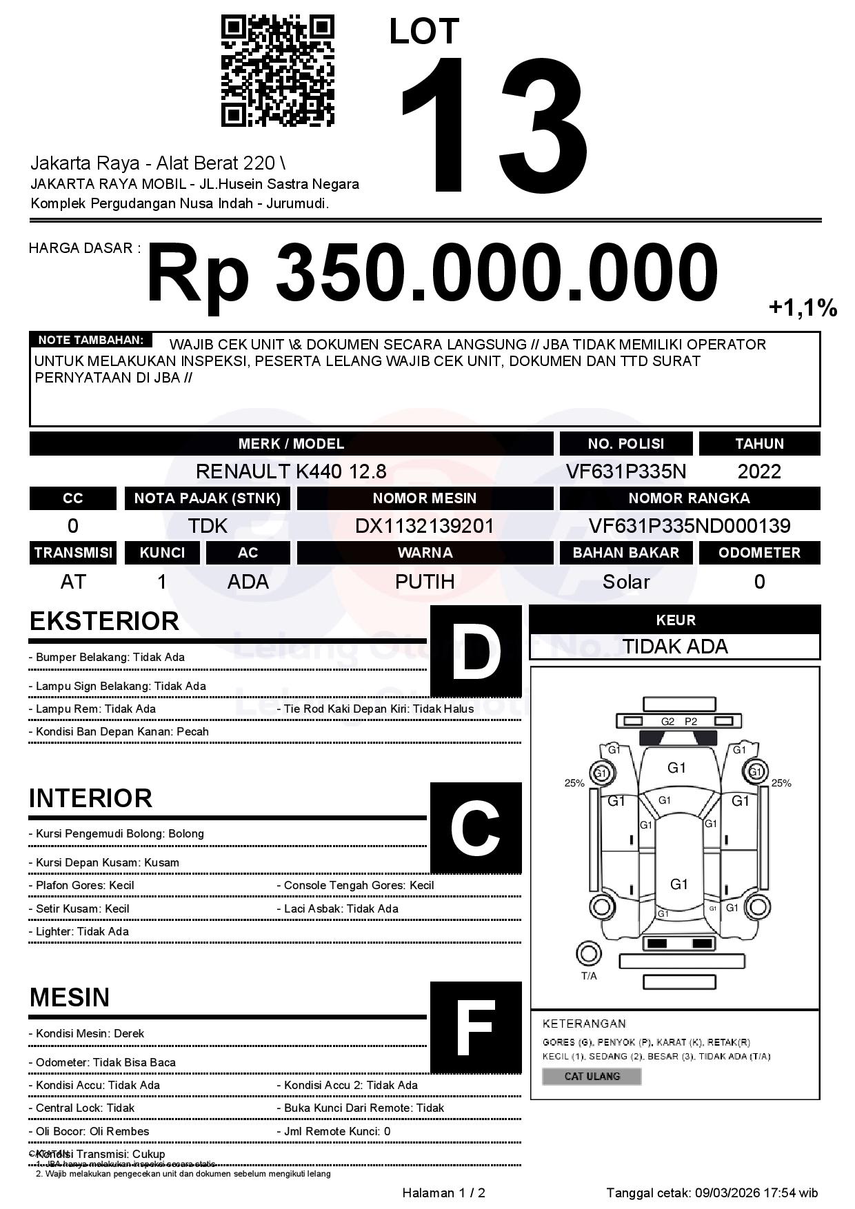 - CatatanWAJIB CEK UNIT & DOKUMEN SECARA LANGSUNG // JBA TIDAK MEMILIKI OPERATOR UNTUK MELAKUKAN INSPEKSI, PESERTA LELANG WAJIB CEK UNIT, DOKUMEN DAN TTD SURAT PERNYATAAN DI JBA //