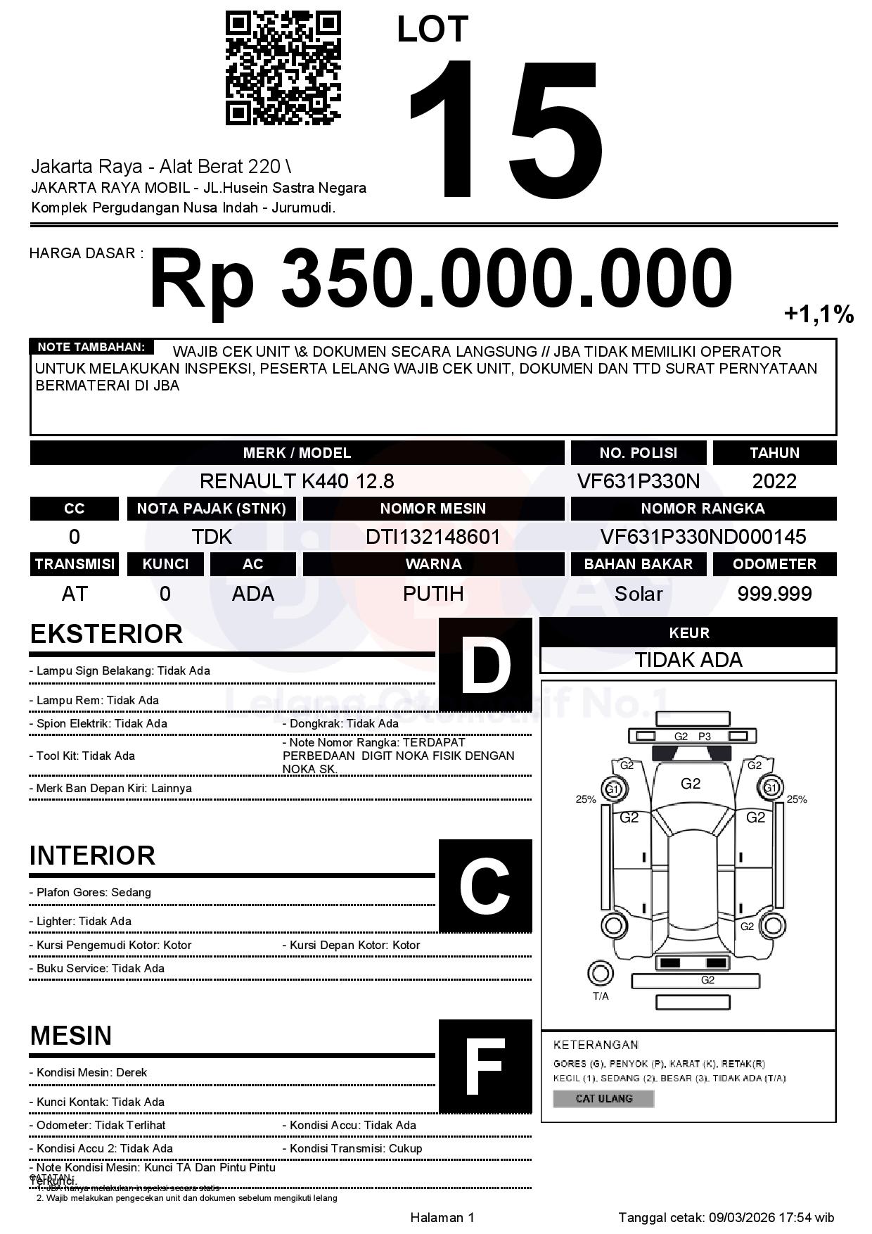 - CatatanWAJIB CEK UNIT & DOKUMEN SECARA LANGSUNG // JBA TIDAK MEMILIKI OPERATOR UNTUK MELAKUKAN INSPEKSI, PESERTA LELANG WAJIB CEK UNIT, DOKUMEN DAN TTD SURAT PERNYATAAN BERMATERAI DI JBA