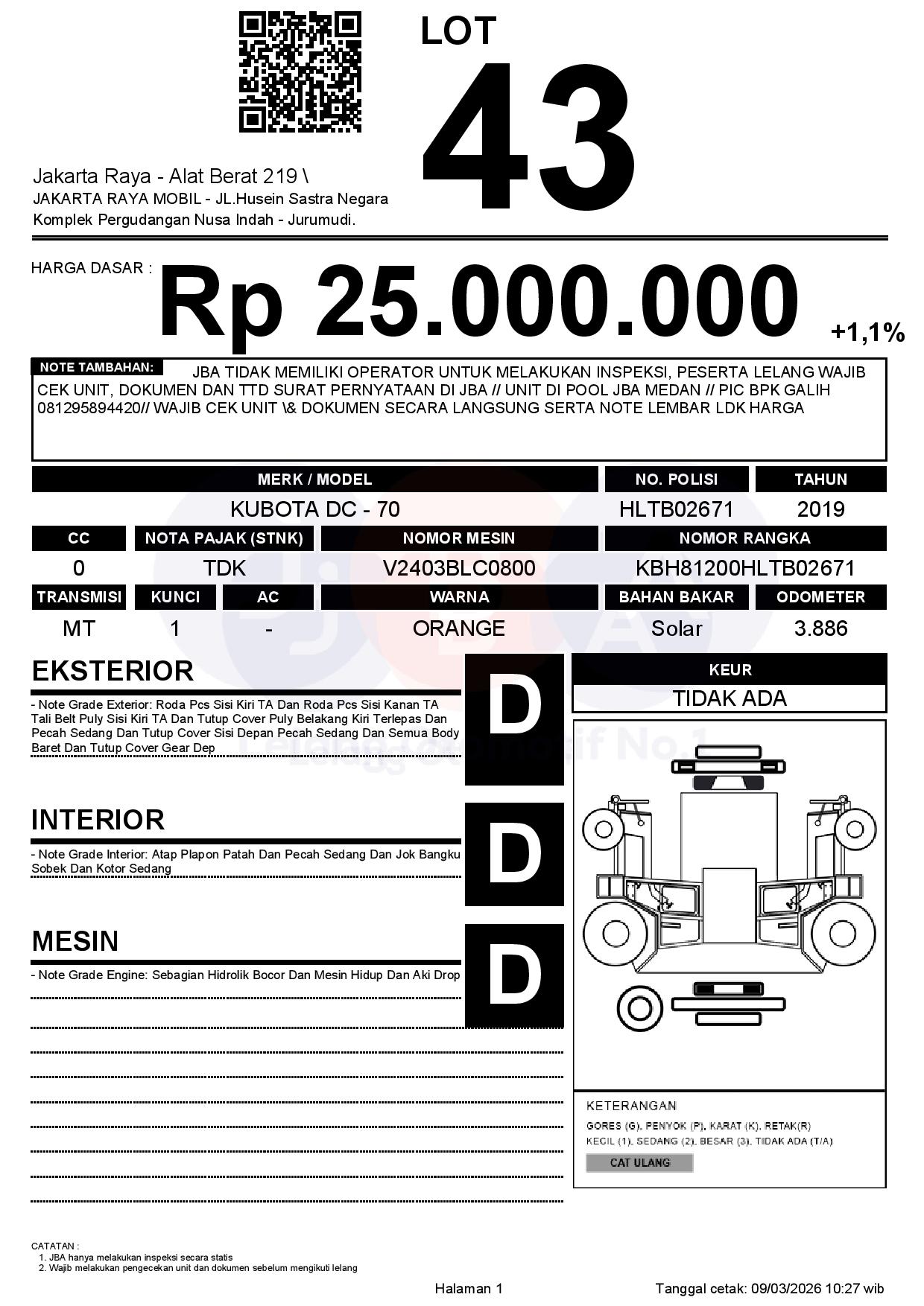 - Catatan JBA TIDAK MEMILIKI OPERATOR UNTUK MELAKUKAN INSPEKSI, PESERTA LELANG WAJIB CEK UNIT, DOKUMEN DAN TTD SURAT PERNYATAAN DI JBA // UNIT DI POOL JBA MEDAN // PIC BPK GALIH 081295894420// WAJIB CEK UNIT & DOKUMEN SECARA LANGSUNG SERTA NOTE LEMBAR LDK HARGA