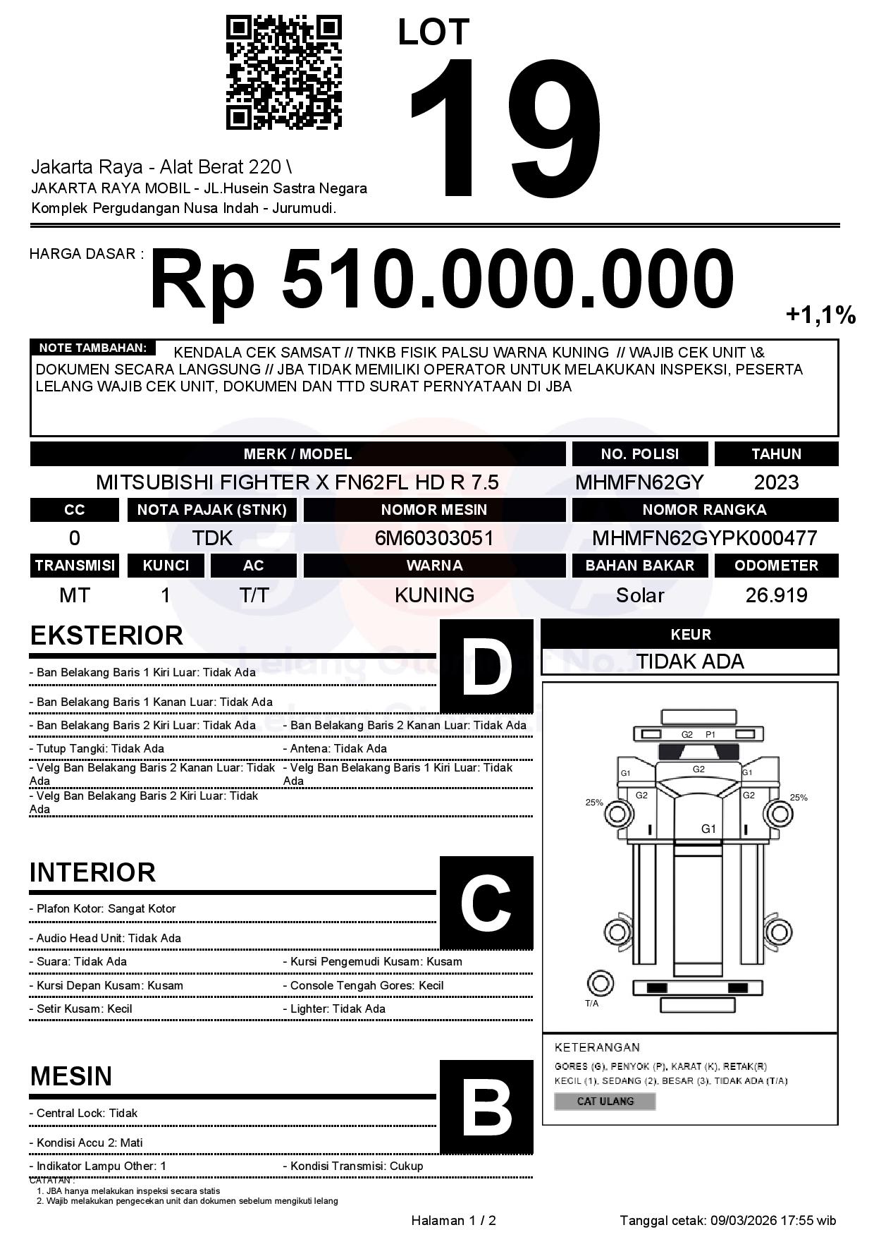 - CatatanKENDALA CEK SAMSAT // TNKB FISIK PALSU WARNA KUNING // WAJIB CEK UNIT & DOKUMEN SECARA LANGSUNG // JBA TIDAK MEMILIKI OPERATOR UNTUK MELAKUKAN INSPEKSI, PESERTA LELANG WAJIB CEK UNIT, DOKUMEN DAN TTD SURAT PERNYATAAN DI JBA