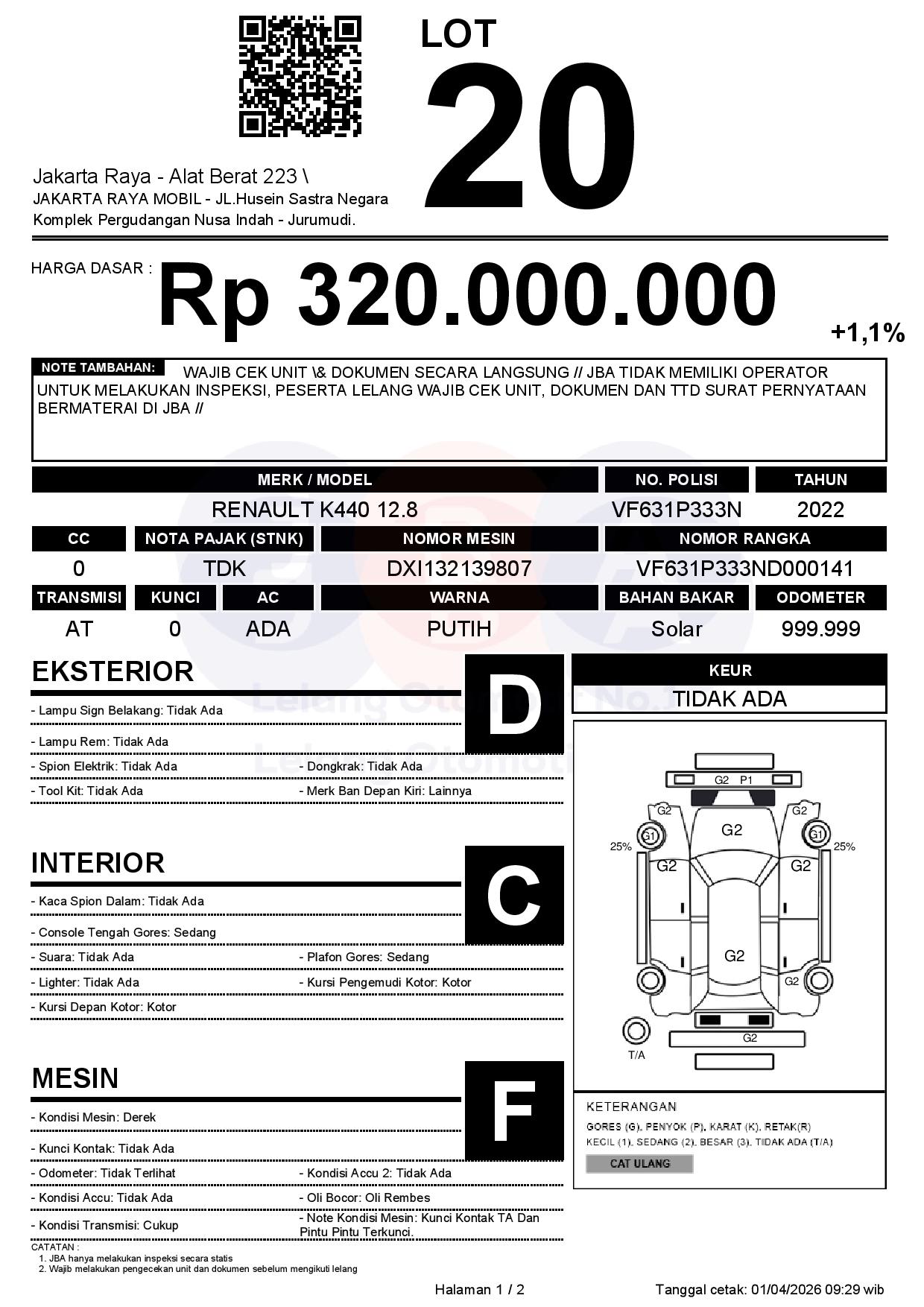 - CatatanWAJIB CEK UNIT & DOKUMEN SECARA LANGSUNG // JBA TIDAK MEMILIKI OPERATOR UNTUK MELAKUKAN INSPEKSI, PESERTA LELANG WAJIB CEK UNIT, DOKUMEN DAN TTD SURAT PERNYATAAN BERMATERAI DI JBA //
