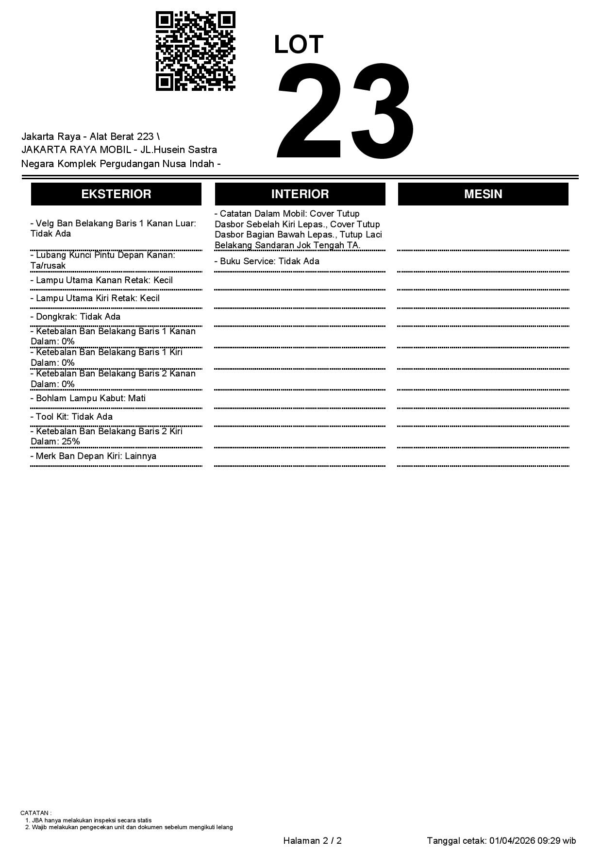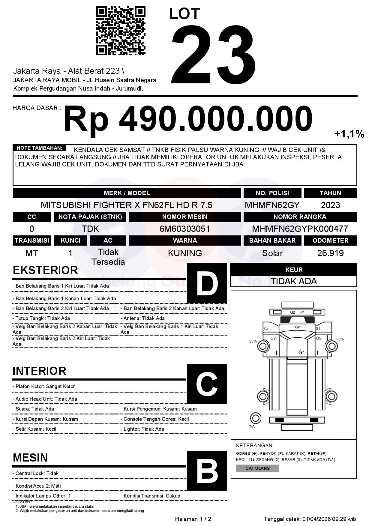 - CatatanKENDALA CEK SAMSAT // TNKB FISIK PALSU WARNA KUNING // WAJIB CEK UNIT & DOKUMEN SECARA LANGSUNG // JBA TIDAK MEMILIKI OPERATOR UNTUK MELAKUKAN INSPEKSI, PESERTA LELANG WAJIB CEK UNIT, DOKUMEN DAN TTD SURAT PERNYATAAN DI JBA