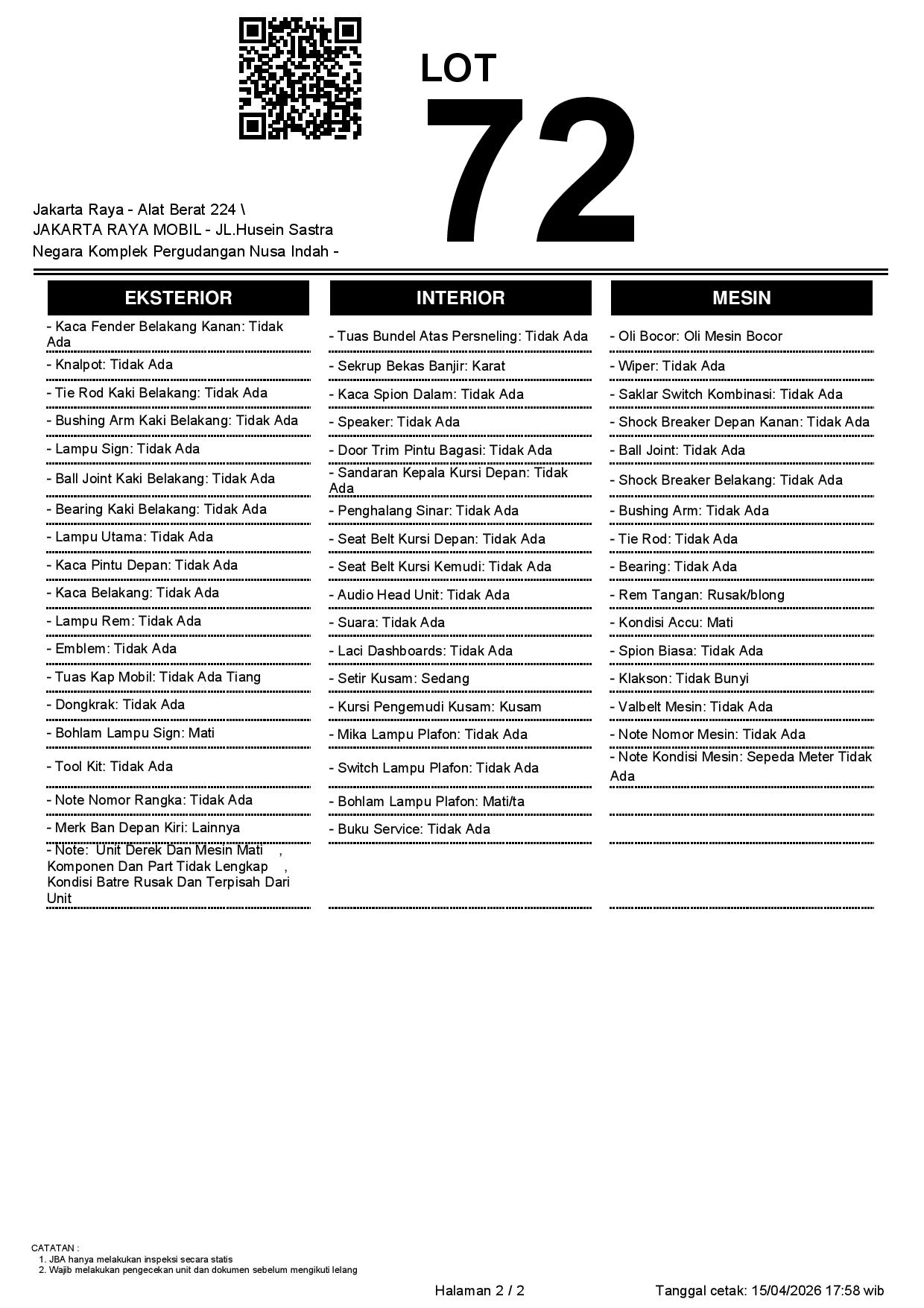 - CatatanUNIT BERADA DI POOL SELLER // WAJIB CEK UNIT & DOKUMEN SECARA LANGSUNG // JBA TIDAK MEMILIKI OPERATOR UNTUK MELAKUKAN INSPEKSI, PESERTA LELANG WAJIB CEK UNIT, DOKUMEN DAN TTD SURAT PERNYATAAN BERMATERAI DI JBA