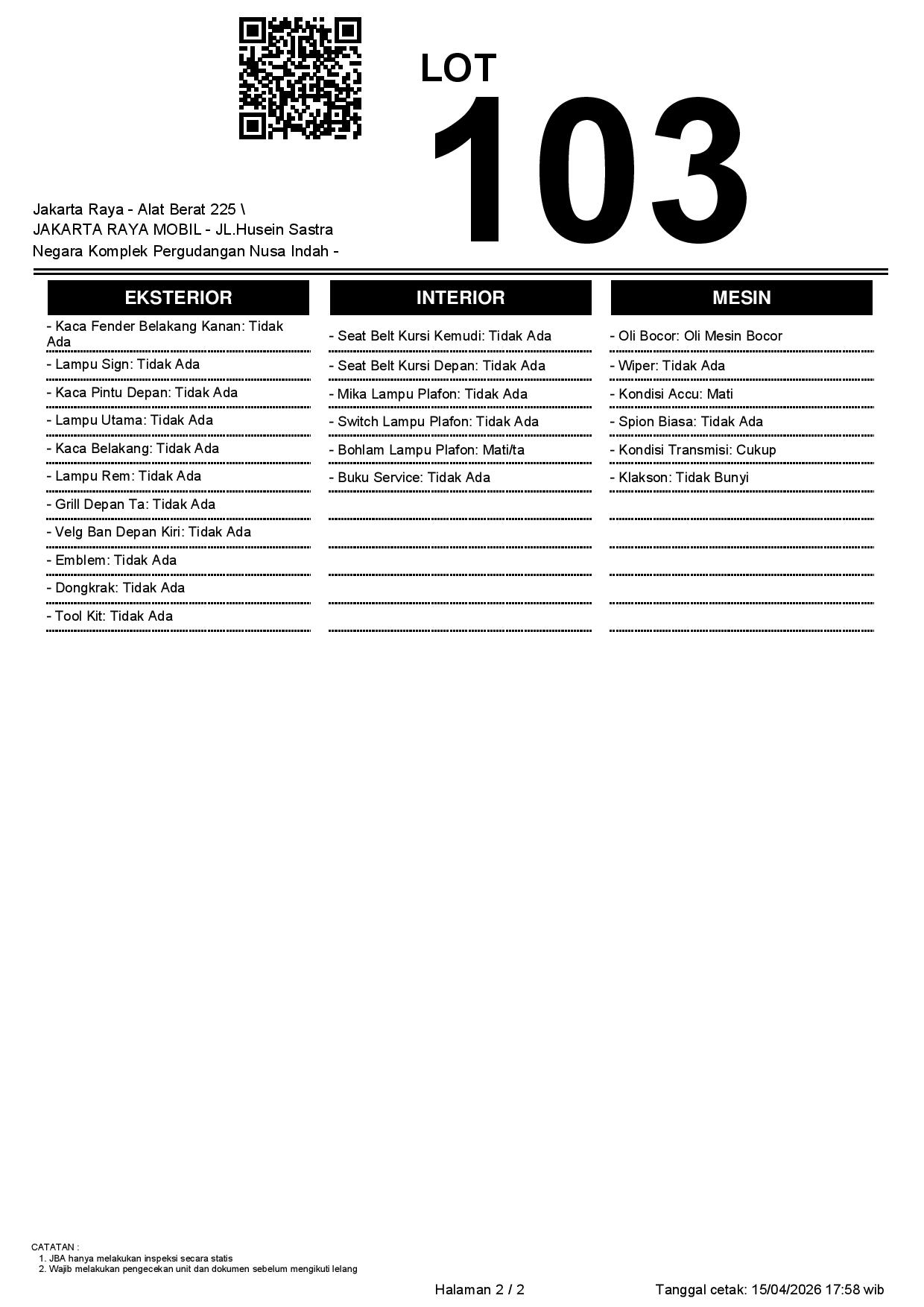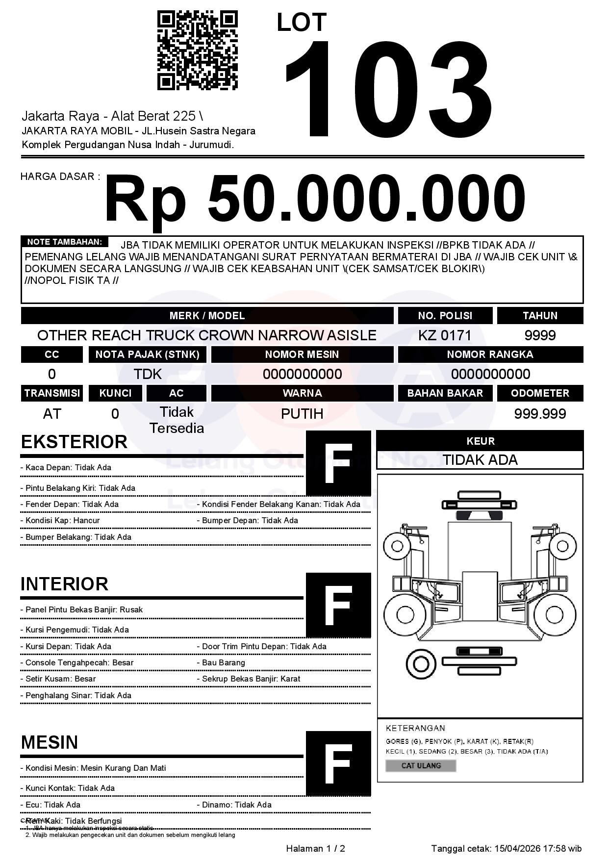- CatatanJBA TIDAK MEMILIKI OPERATOR UNTUK MELAKUKAN INSPEKSI //BPKB TIDAK ADA // PEMENANG LELANG WAJIB MENANDATANGANI SURAT PERNYATAAN BERMATERAI DI JBA // WAJIB CEK UNIT & DOKUMEN SECARA LANGSUNG // WAJIB CEK KEABSAHAN UNIT (CEK SAMSAT/CEK BLOKIR) //NOPOL FISIK TA //