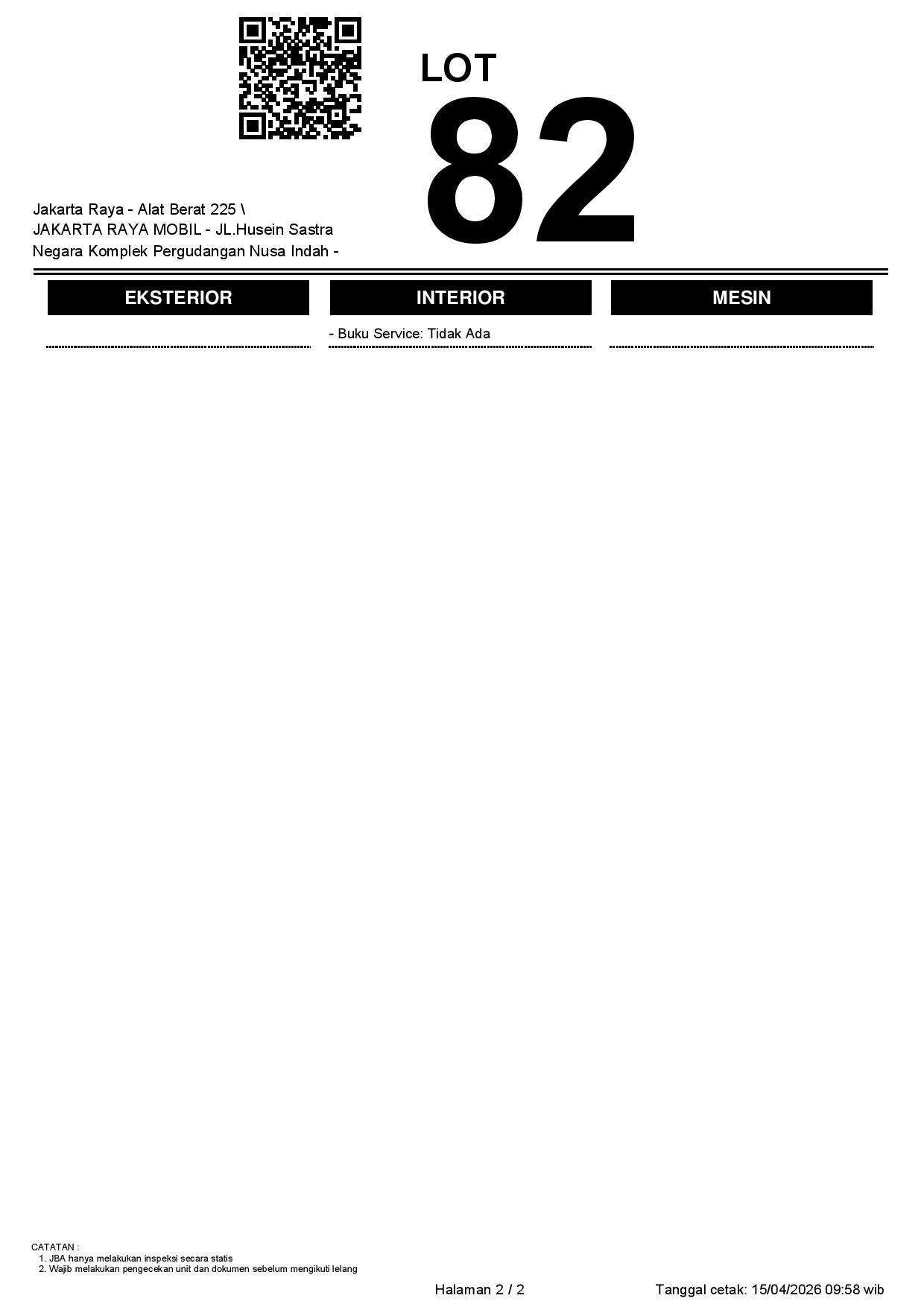 - CatatanWAJIB CEK UNIT & DOKUMEN SECARA LANGSUNG // JBA TIDAK MEMILIKI OPERATOR UNTUK MELAKUKAN INSPEKSI, PESERTA LELANG WAJIB CEK UNIT, DOKUMEN DAN TTD SURAT PERNYATAAN DI JBA