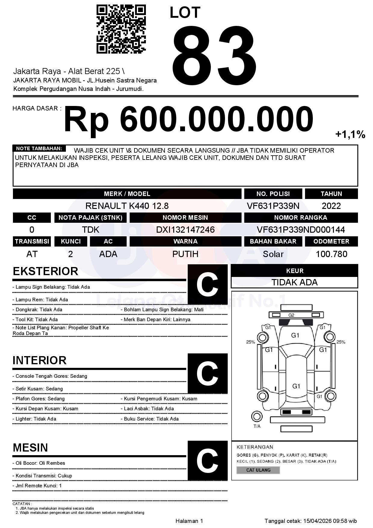 - CatatanWAJIB CEK UNIT & DOKUMEN SECARA LANGSUNG // JBA TIDAK MEMILIKI OPERATOR UNTUK MELAKUKAN INSPEKSI, PESERTA LELANG WAJIB CEK UNIT, DOKUMEN DAN TTD SURAT PERNYATAAN DI JBA