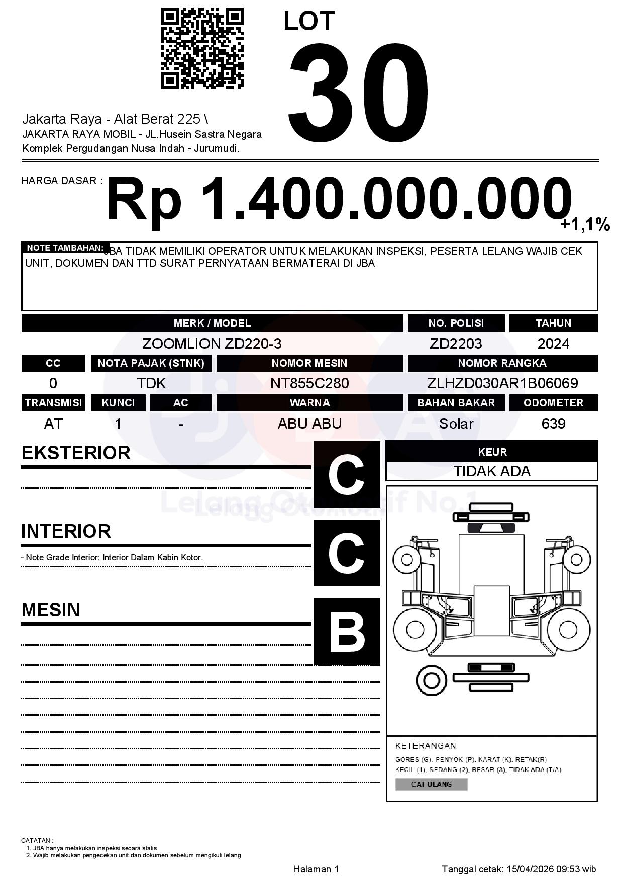 - CatatanJBA TIDAK MEMILIKI OPERATOR UNTUK MELAKUKAN INSPEKSI, PESERTA LELANG WAJIB CEK UNIT, DOKUMEN DAN TTD SURAT PERNYATAAN BERMATERAI DI JBA