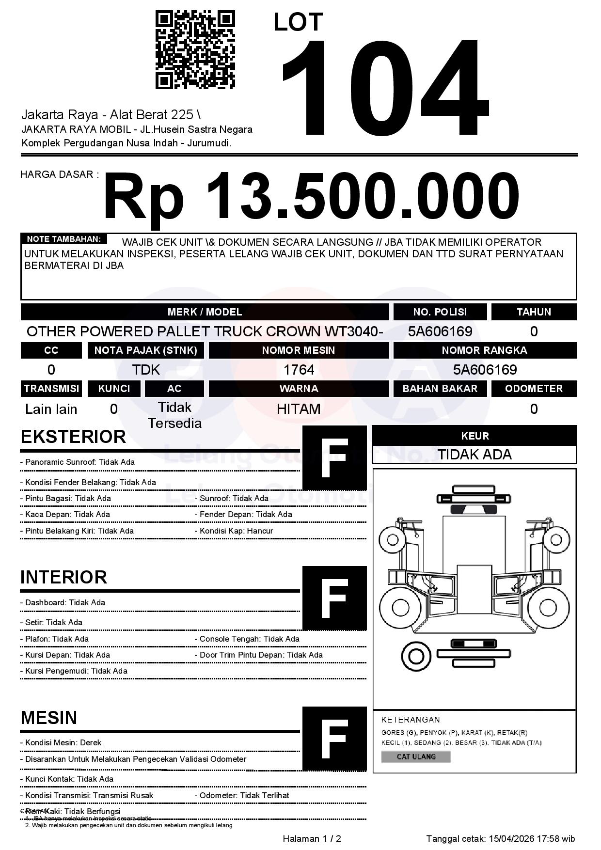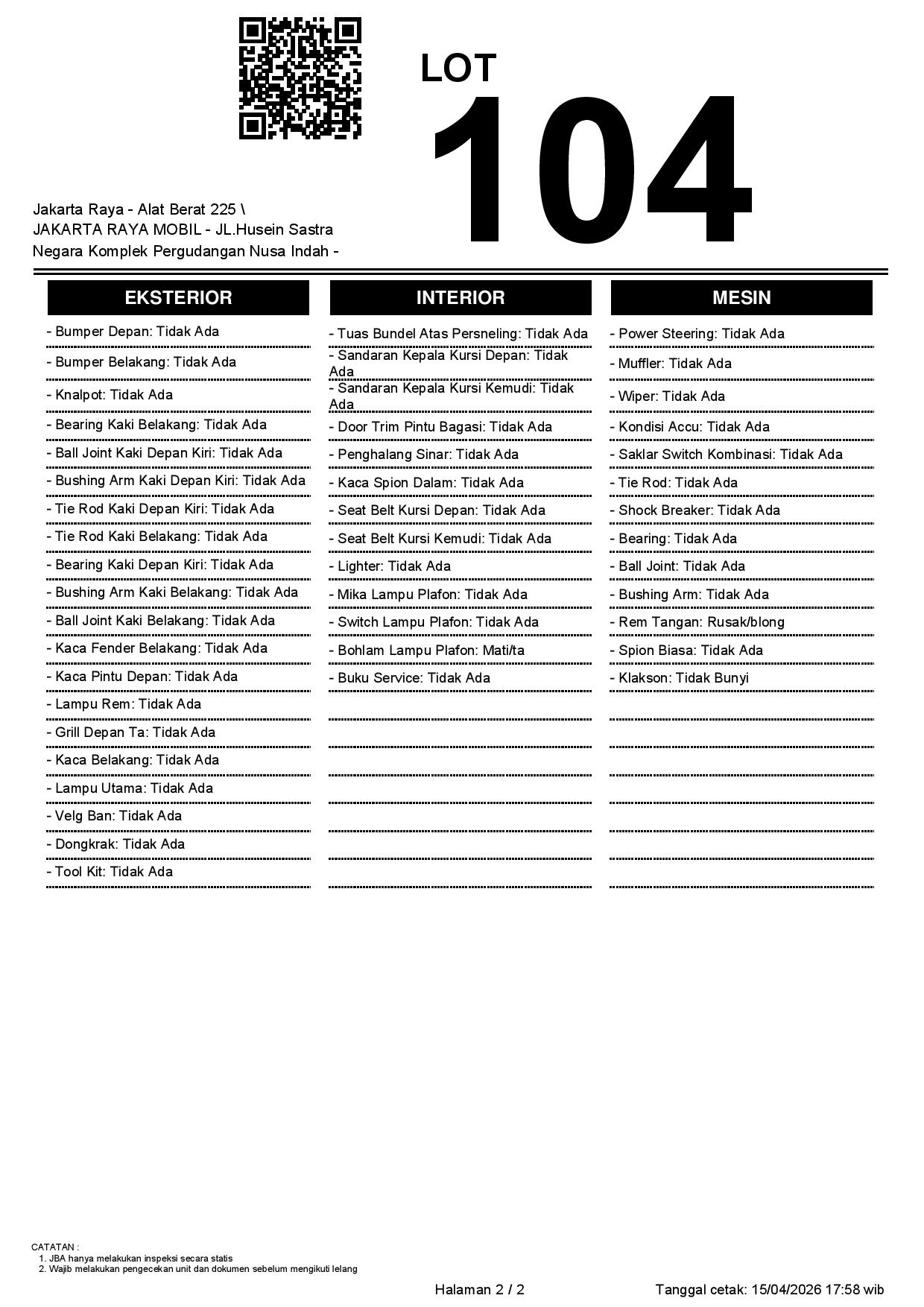 - Catatan WAJIB CEK UNIT & DOKUMEN SECARA LANGSUNG // JBA TIDAK MEMILIKI OPERATOR UNTUK MELAKUKAN INSPEKSI, PESERTA LELANG WAJIB CEK UNIT, DOKUMEN DAN TTD SURAT PERNYATAAN BERMATERAI DI JBA