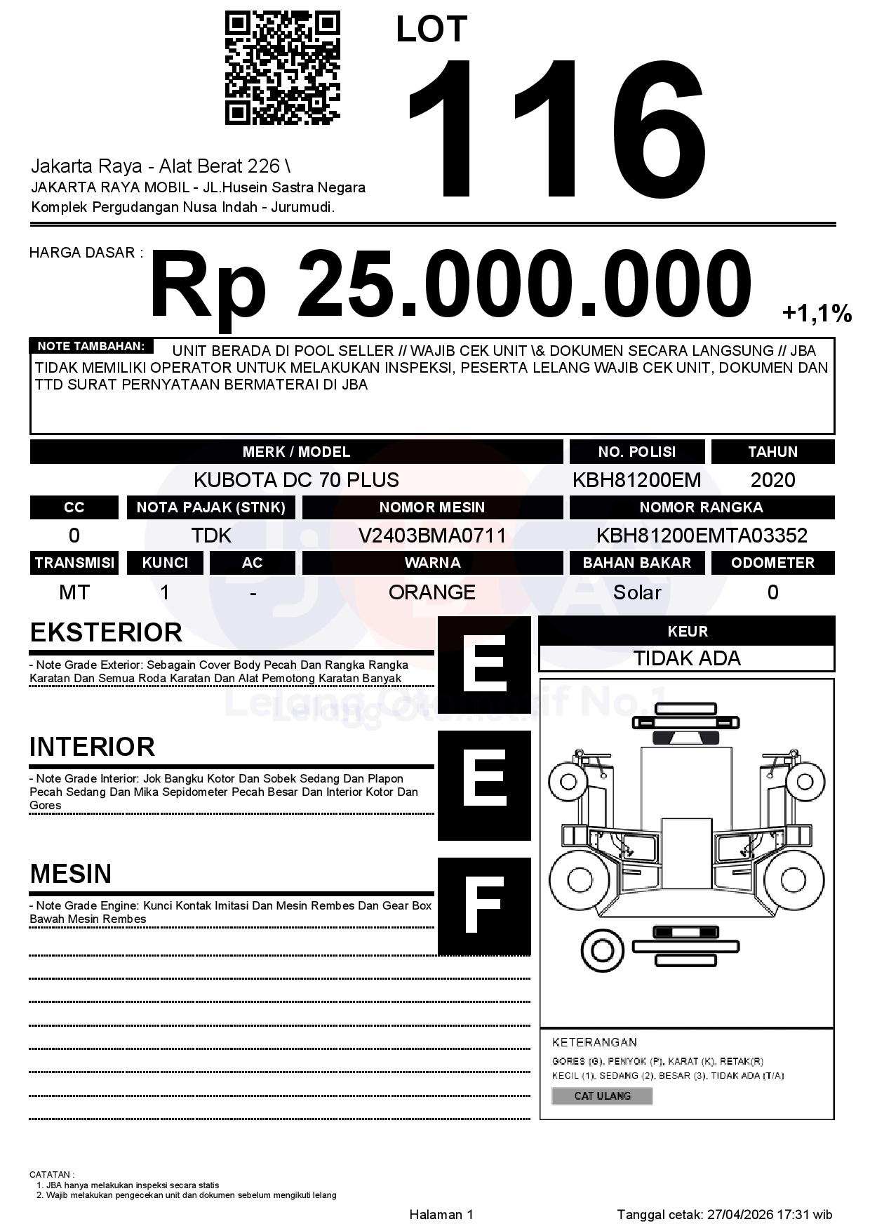 - CatatanUNIT BERADA DI POOL SELLER // WAJIB CEK UNIT & DOKUMEN SECARA LANGSUNG // JBA TIDAK MEMILIKI OPERATOR UNTUK MELAKUKAN INSPEKSI, PESERTA LELANG WAJIB CEK UNIT, DOKUMEN DAN TTD SURAT PERNYATAAN BERMATERAI DI JBA